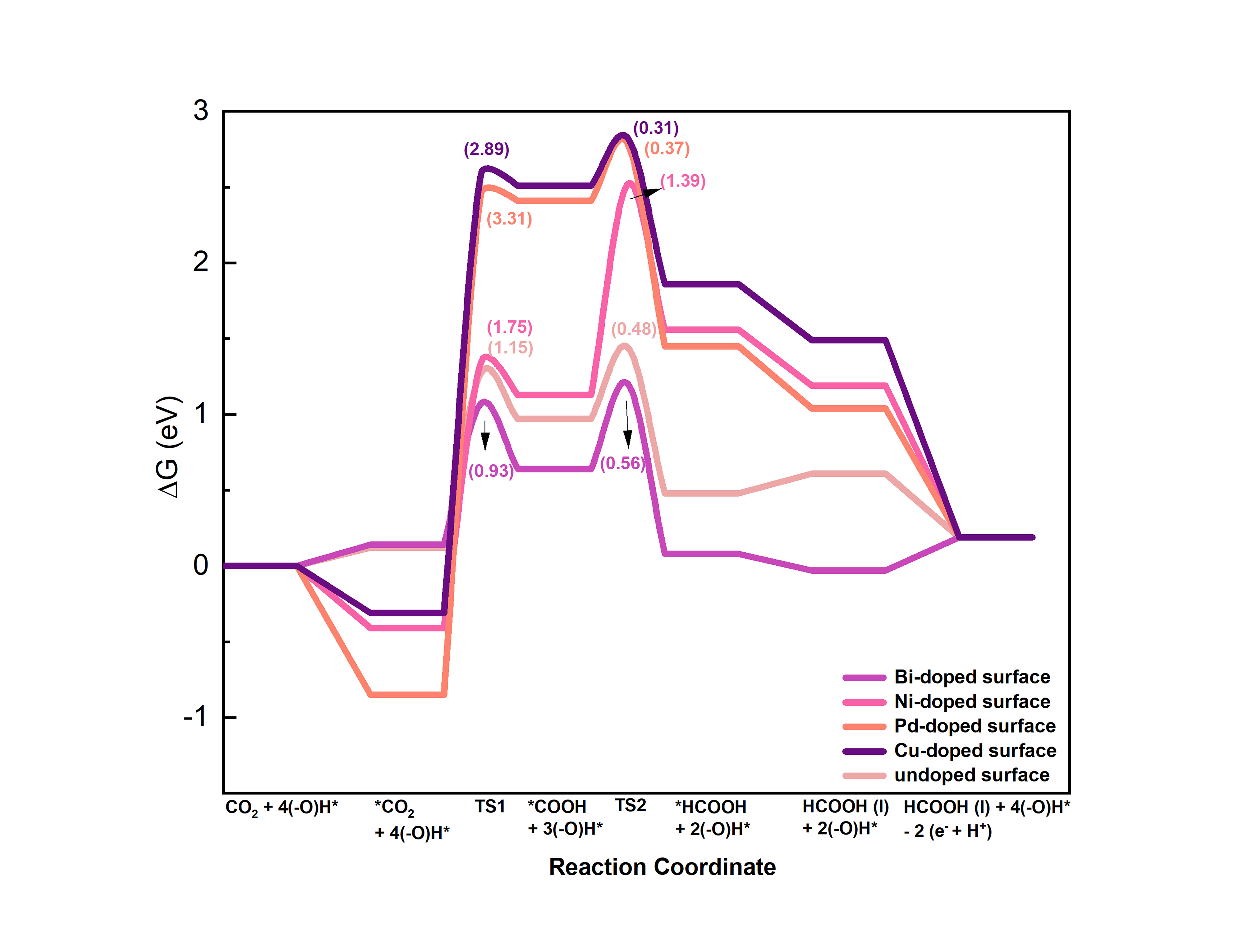 | Fig. 4. Reaction energy diagram for CO2RR on metal-doped SnO2?x(OH)4 surface at standard conditions (T = 298.15 K, P = 1 bar, pH = 0, and 0 V vs. RHE). |
